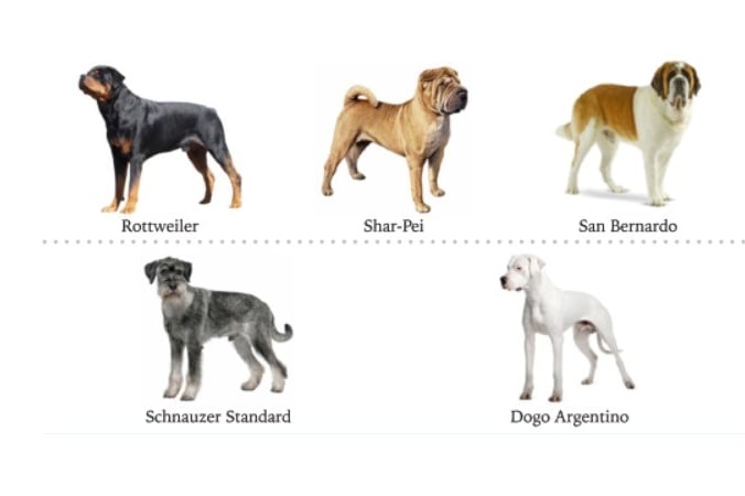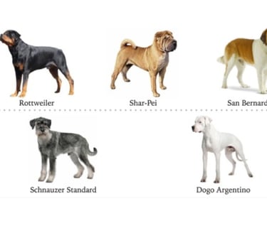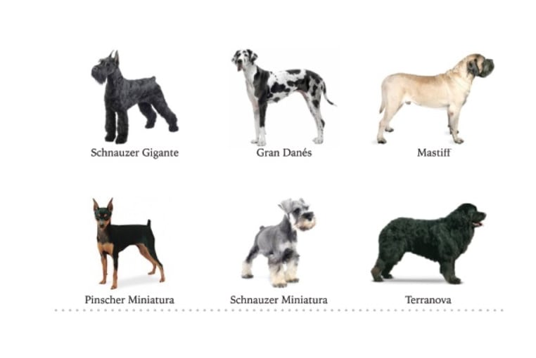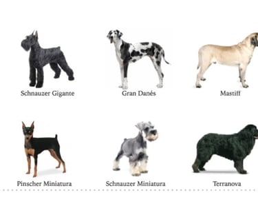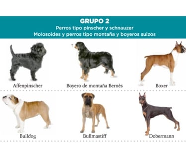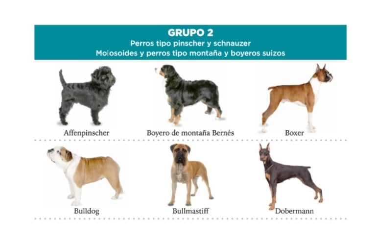Perros tipo pinsher y schnauzer, molosoides, perros tipo de montaña y perros boyeros suizos.